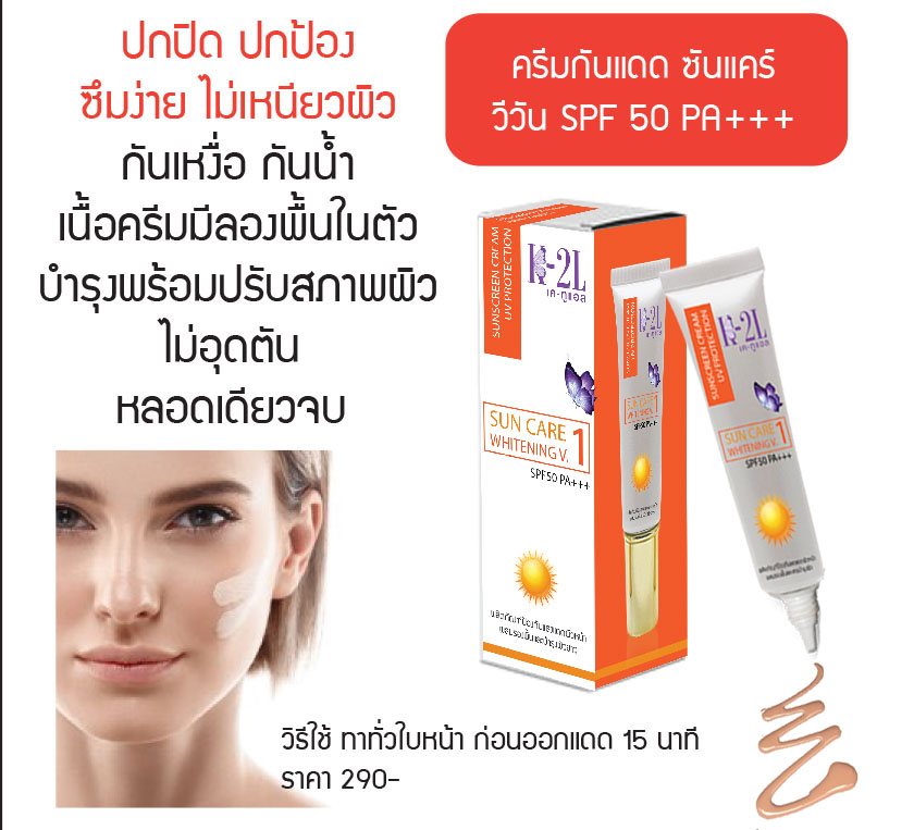 ชื่อสินค้า : ครีมกันแดด วี 1 [sunv1]รายละเอียด : กันแดด ซันแคร์วีวัน ไวท์เทนนิ่ง ครีมบำรุงพร้อมปกป้องผิวจากรังสี UVA และ UVB ได้อย่างมีประสิทธิภาพ ด้วยส่วนผสมคุณค่าจาก Hydrolyzed พิเศษ ชุดละ : 290.00
